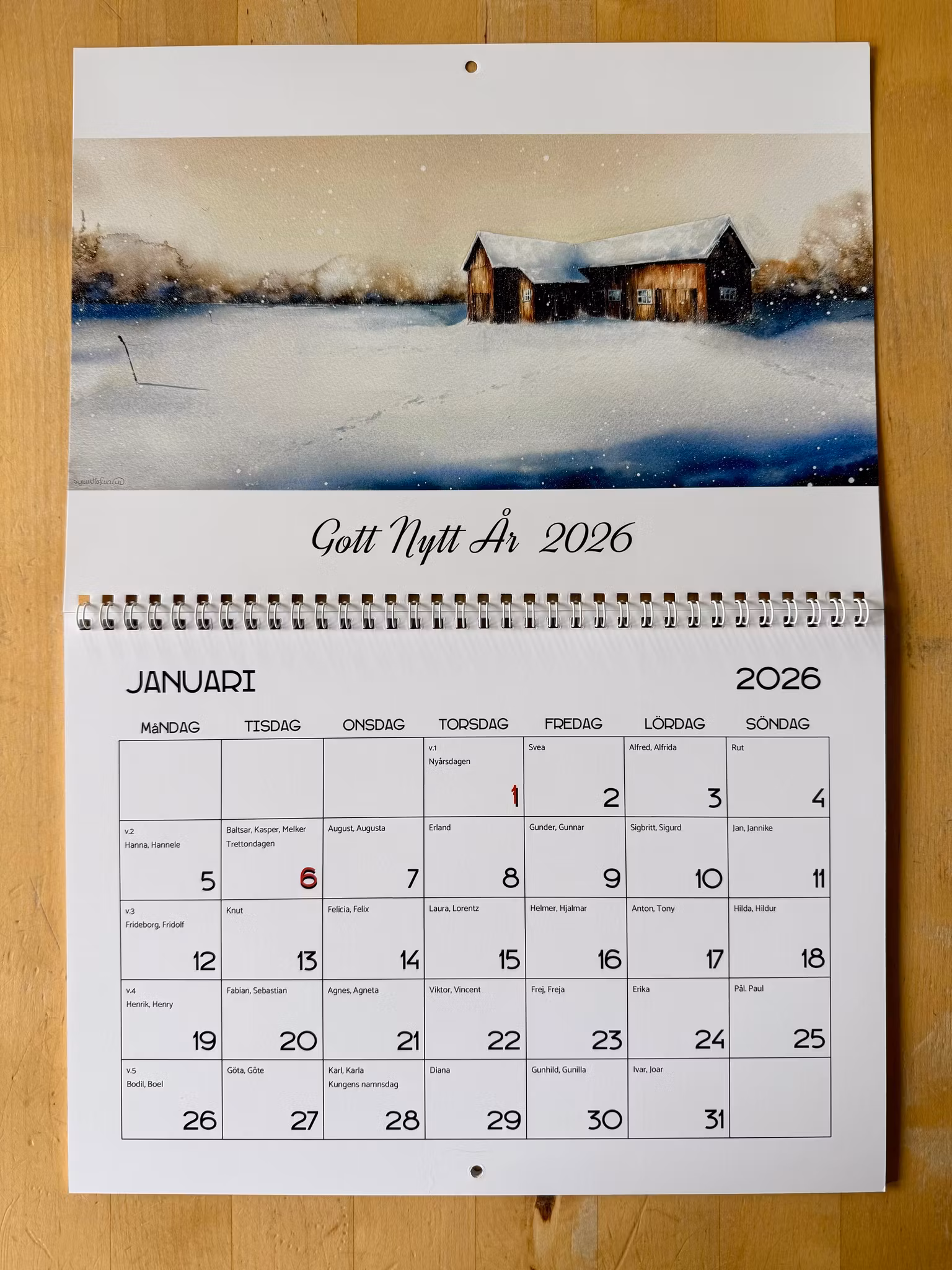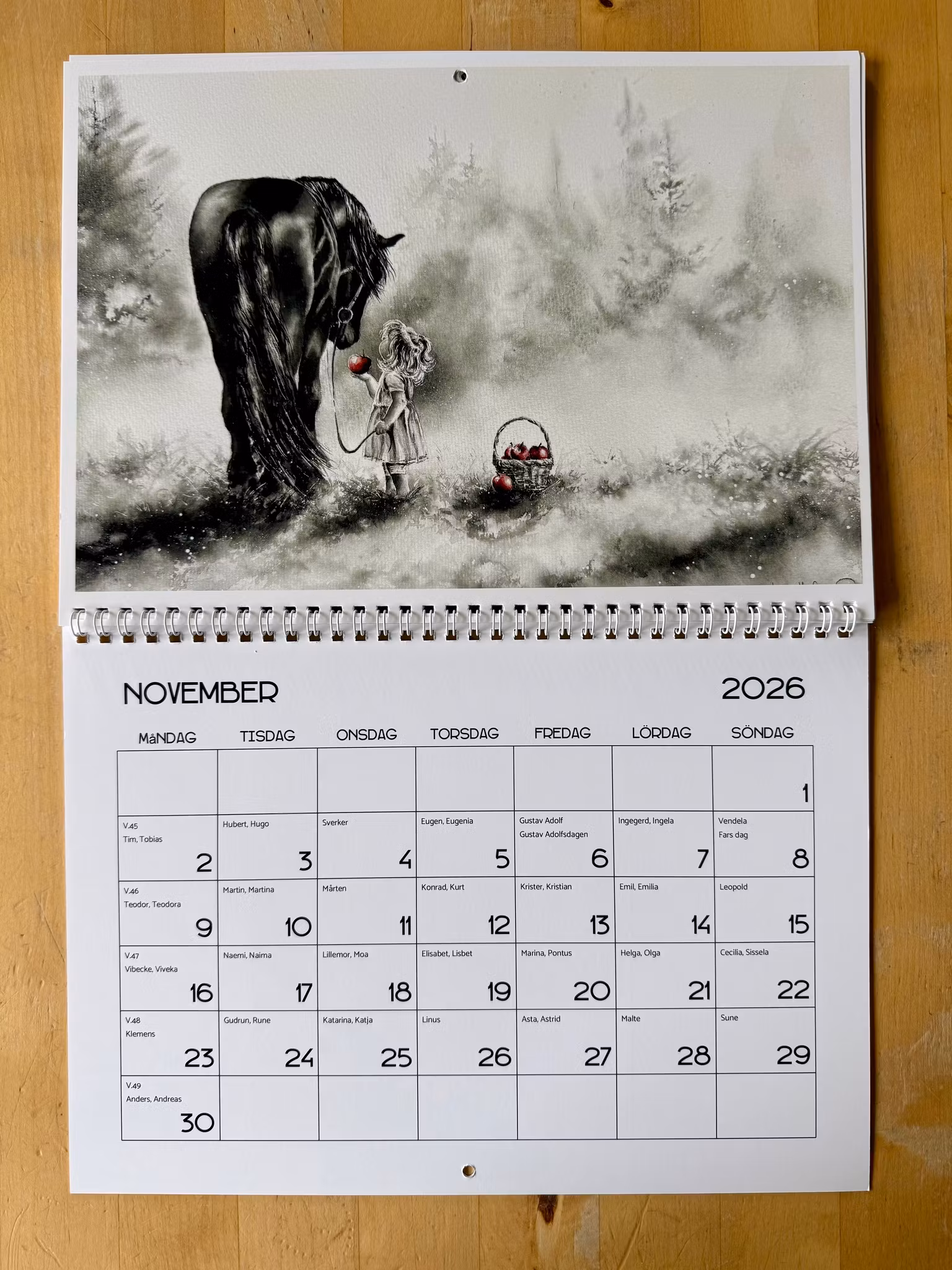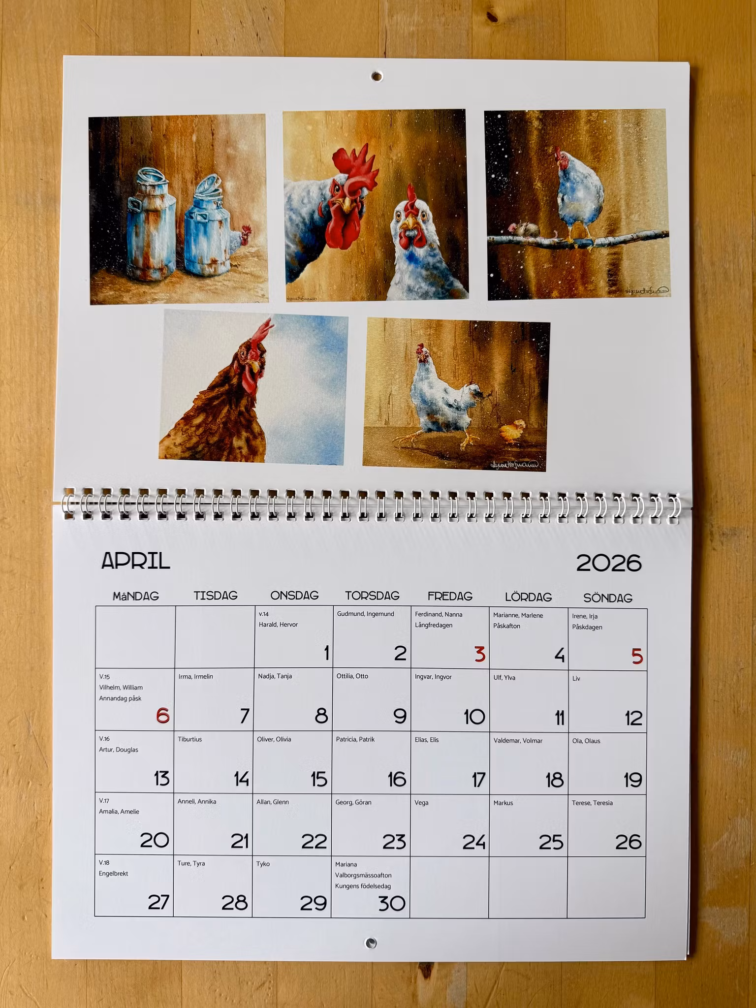Konstkalender 2026 350 SEK Produkten är slut i lager Dela Information Denna väggkalender är en klassisk dubbel A4 med spiralbindning i mitten. Utfälld mäter den 30*42 cm. Den innehåller namnsdagar och röda dagar.Ev frakt tillkommer med 67 kr.