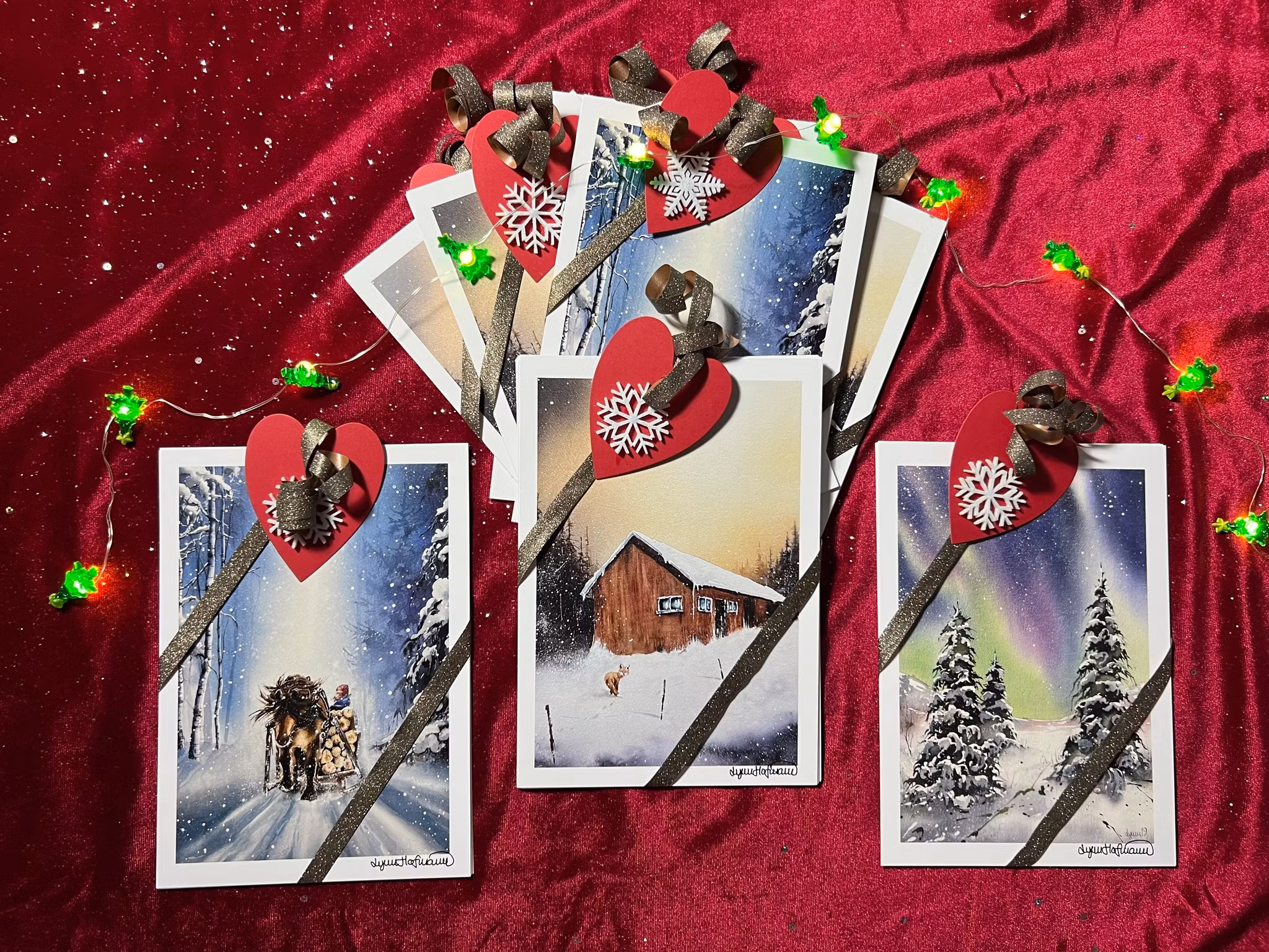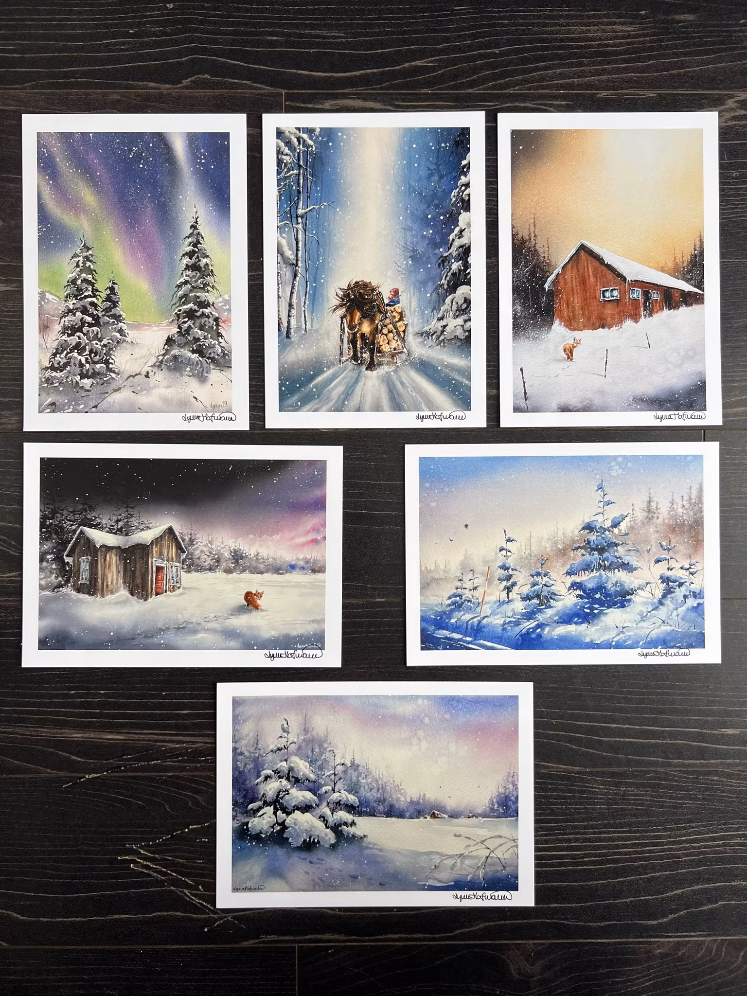 Dessa konstkort med vintermotiv är tryckta på ett matt och lågreflekterande 360 gr papper och har storleken 15*21 cm. På baksidan finns jul och nyårshälsning samt adressfält om man vill använda dem som julkort. Eftersom utan är matt och de har en större storlek än vykortstorlek så fungerar de utmärkt att rama in. Konstkorten är naturligtvis signerade av mig och levererad ”juligt” inslagna i 6-pack.